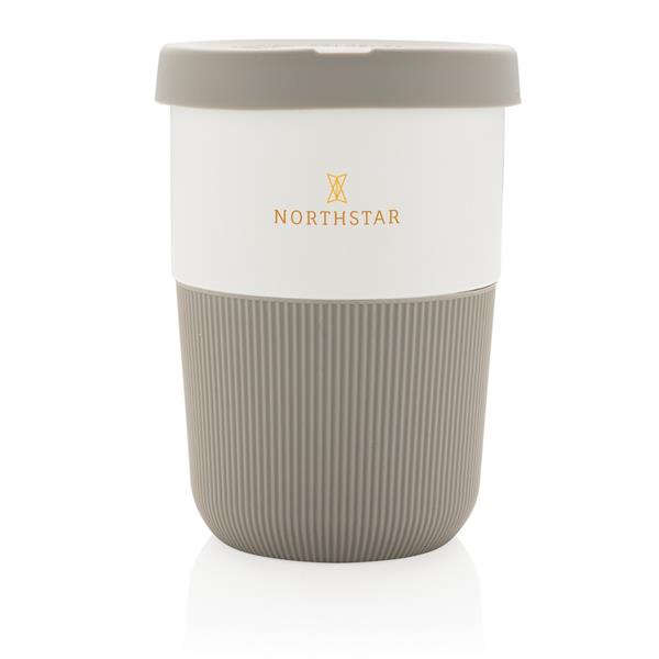 Kubek podróżny 380 ml, wykonany z PLA, silikonowe wieczko i uchwyt, nie zawiera melaminy, ślad węglowy produktu: 0,89 kg CO2