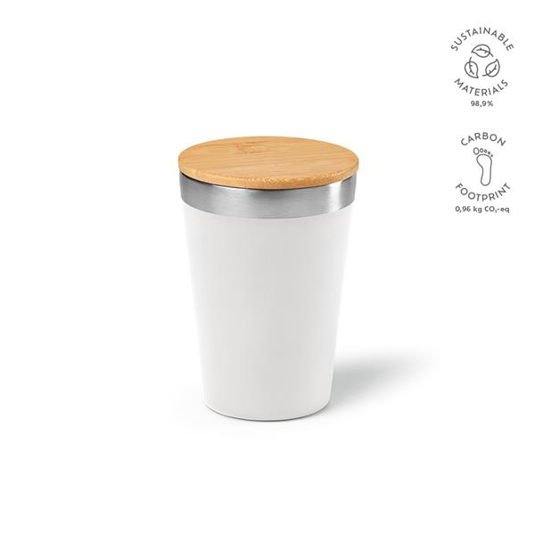 Wzbogać swoje łyki dzięki naszemu kubkowi podróżnemu o pojemności 390 ml (320 ml netto) ze stali nierdzewnej pochodzącej z recyklingu, który będzie Twoim ulubieńcem. Ma podwójne ścianki izolacyjne zapewniające idealną temperaturę napoju. Bambusowa pokrywka dodaje naturalnego akcentu. Pij w sposób przyjazny środowisku.