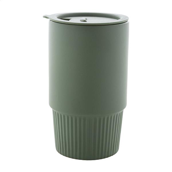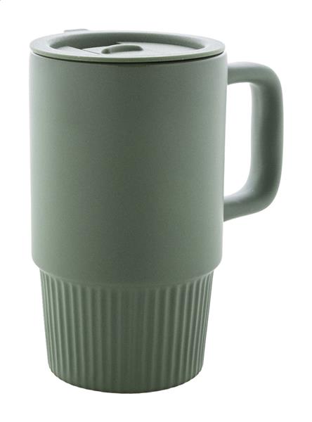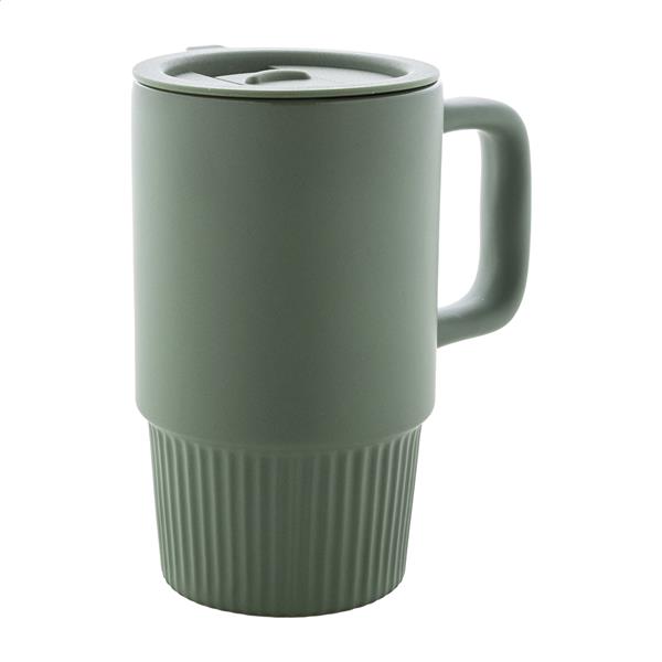 Wysokiej jakości ceramiczny kubek podróżny z matowym wykończeniem zewnętrznym i plastikową pokrywką PP. Pojemność 420 ml.