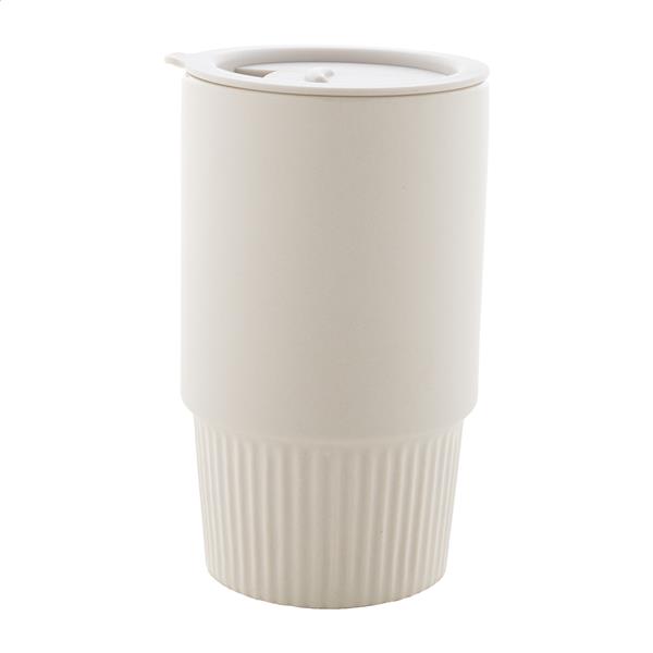 Wysokiej jakości ceramiczny kubek podróżny z matowym wykończeniem zewnętrznym i plastikową pokrywką PP. Pojemność 420 ml.