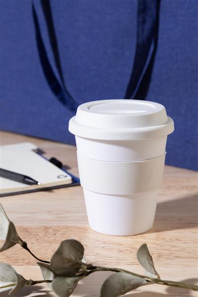 Kubek podróżny z jedną ścianką, wykonany z tworzywa PP, z pokrywką i uchwytem z tworzywa TPE. Pojemność 350 ml.