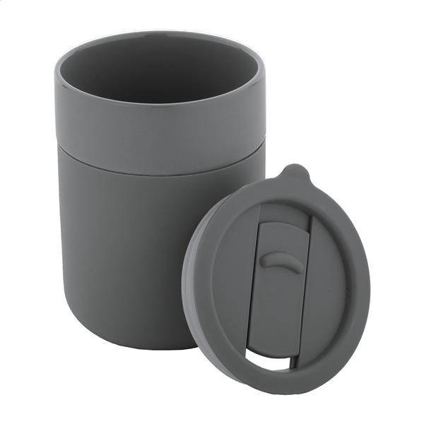 Ceramiczny kubek podróżny pokryty silikonem z pokrywką do picia z tworzywa sztucznego PP. 300ml.