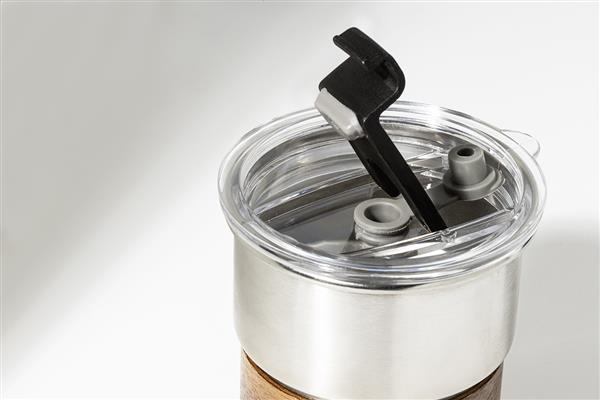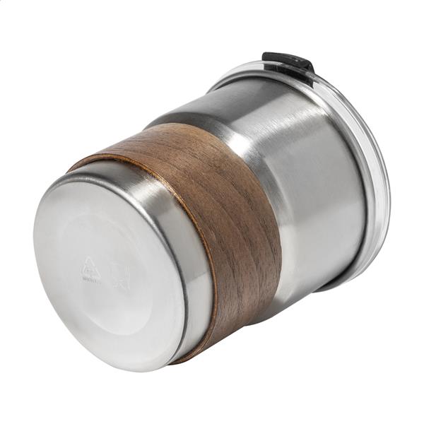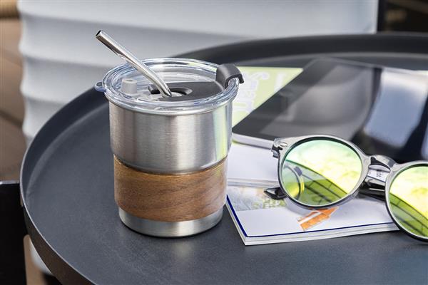 Kubek podróżny z jedną ścianką, wykonany z recyklingowanej stali nierdzewnej, z uchwytem z drewna orzechowego, plastikową pokrywką i słomką z recyklingowanej stali nierdzewnej. 260 ml.