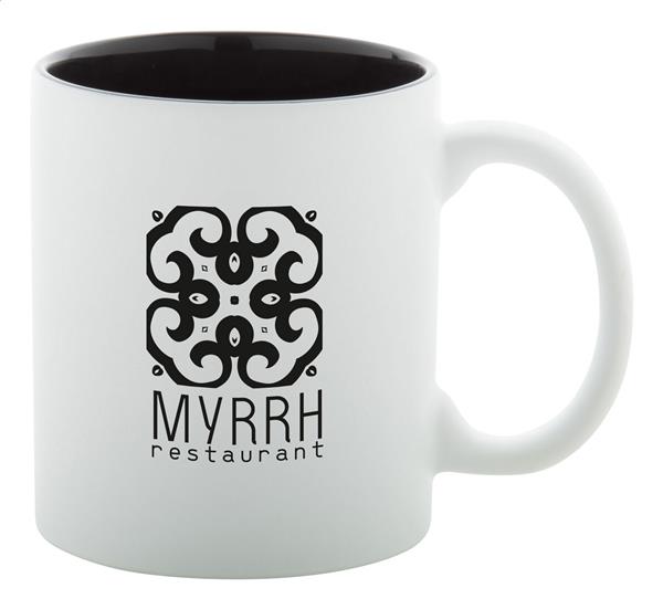 Bílý keramický hrnek, barevný uvnitř, 350 ml. Vygravírované logo je do barvy vnitřku. V dárkové krabičce.