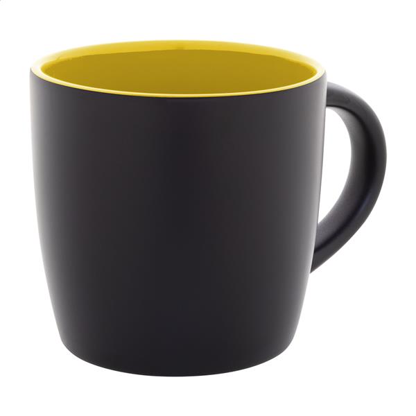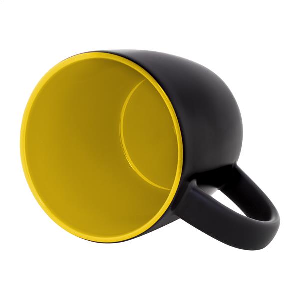 Czarny kubek ceramiczny z kolorowym wnętrzem, pojemność 300 ml. Dzięki specjalnej powłoce do grawerowania, wygrawerowane logo jest dopasowane do koloru wnętrza. W pudełku z papieru kraft.