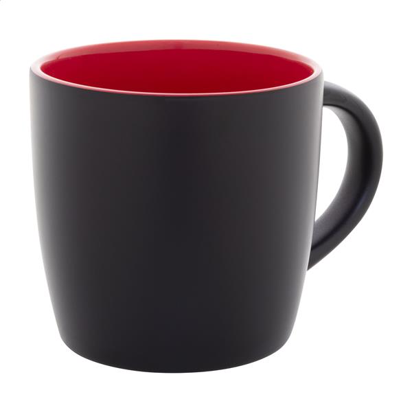Czarny kubek ceramiczny z kolorowym wnętrzem, pojemność 300 ml. Dzięki specjalnej powłoce do grawerowania, wygrawerowane logo jest dopasowane do koloru wnętrza. W pudełku z papieru kraft.