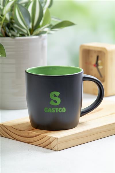 Czarny kubek ceramiczny z kolorowym wnętrzem, pojemność 300 ml. Dzięki specjalnej powłoce do grawerowania, wygrawerowane logo jest dopasowane do koloru wnętrza. W pudełku z papieru kraft.