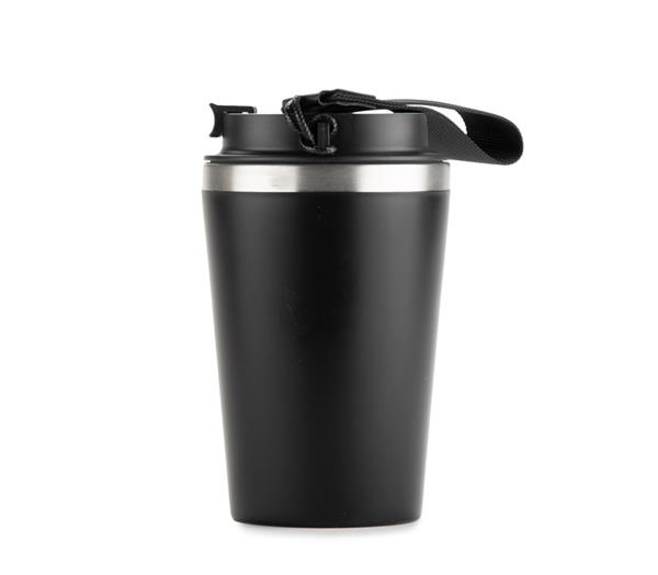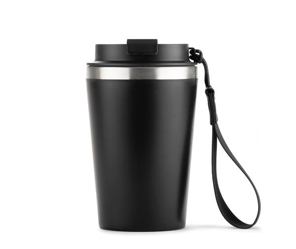 Kubek termiczny SORSO o pojemności 350 ml to praktyczny model zaprojektowany do picia kawy w biegu. Wyposażony w pokrywkę typu flip-top z klapką otwieraną od góry i mechanizmem „podnieś”, umożliwia wygodne korzystanie jedną ręką. Podwójne ścianki pomagają utrzymać temperaturę napoju do 2 godzin, a dołączony uchwyt w formie smyczy ułatwia przenoszenie. Prosta forma i matowe wykończenie sprawiają, że kubek dobrze sprawdza się w codziennym użytkowaniu.