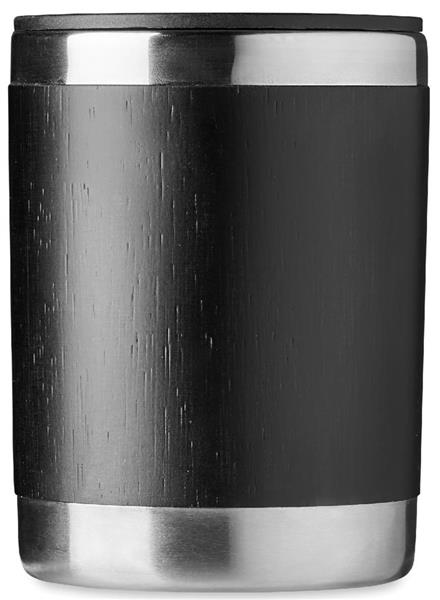 Kubek ze stali nierdzewnej z podwójnymi ściankami, bambusowa obudowa i obrotowy otwór do picia. Pojemność 300 ml. Bambus jest produktem naturalnym, dlatego mogą wystąpić nieznaczne różnice w kolorze, wzorze i rozmiarze.