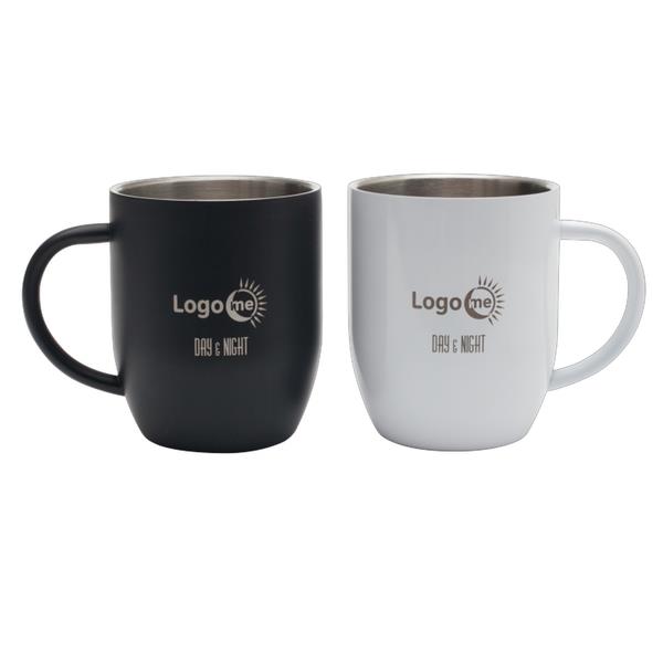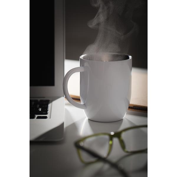 Kubek o pojemności 350 ml z dwiema ściankami ze stali nierdzewnej, wewnątrz kubka stal o podwyższonej jakości 18/8. Pokryty błyszczącym lakierem. Kształtem nawiązuje do kubków ceramicznych.