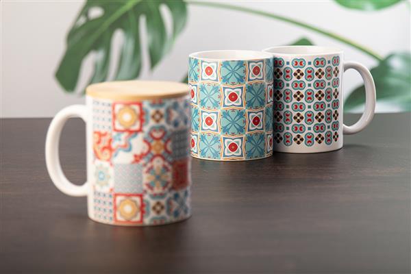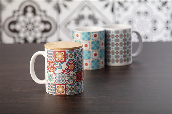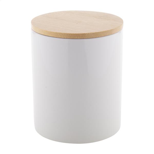 Biały kubek ceramiczny z bambusową pokrywką do nadruku sublimacyjnego, można myć w zmywarce, pojemność 300 ml. W pudełku z papieru kraft.
