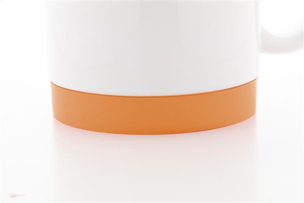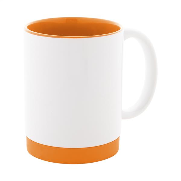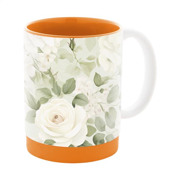 Kubek ceramiczny do sublimacji z kolorowym wnętrzem i dopasowanym kolorystycznie silikonowym pierścieniem na spodzie. Pojemność 300 ml. W białym kartoniku.