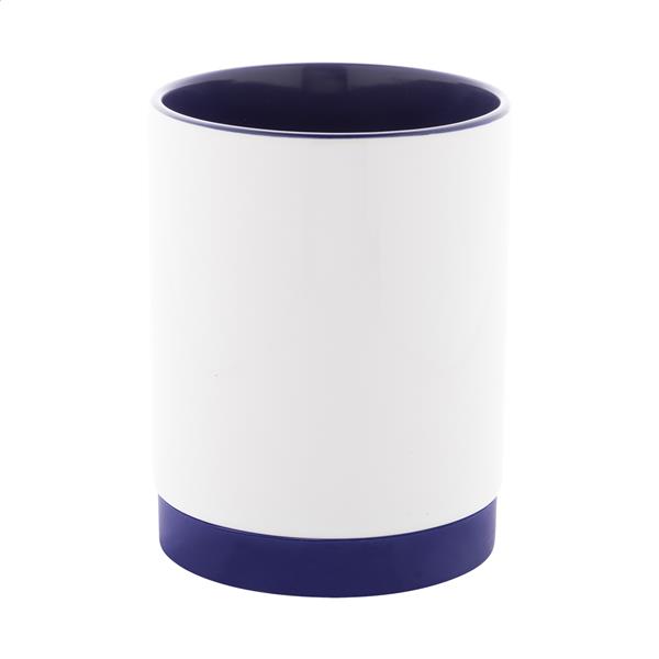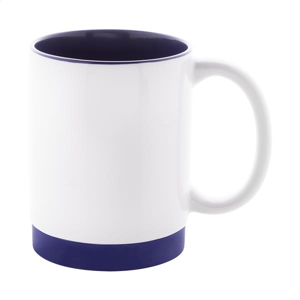 Kubek ceramiczny do sublimacji z kolorowym wnętrzem i dopasowanym kolorystycznie silikonowym pierścieniem na spodzie. Pojemność 300 ml. W białym kartoniku.