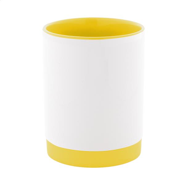 Kubek ceramiczny do sublimacji z kolorowym wnętrzem i dopasowanym kolorystycznie silikonowym pierścieniem na spodzie. Pojemność 300 ml. W białym kartoniku.