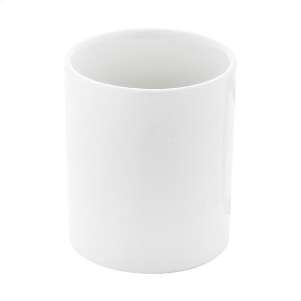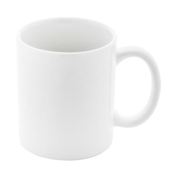 Kubek ceramiczny w kolorze białym, nadający się do mycia w zmywarce, o pojemności 300 ml, przeznaczony do nadruku sublimacyjnego. W białym kartoniku.