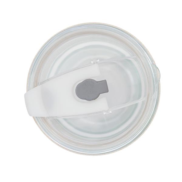 Kubek ze szkła z uchwytem z ekoskóry i plastikową pokrywką, Pojemność 350 ml.