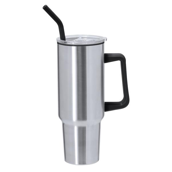 Kubek termiczny 1200 ml z pokrywką, rączką i słomką, czarne wnętrze z PP, posiada podwójne ścianki, które spowalniają oddawanie temperatury na zewnątrz, produkt wykonany ze stali nierdzewnej