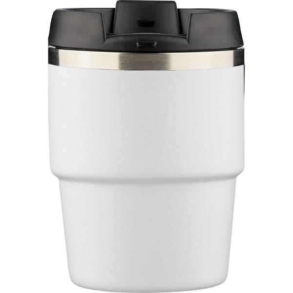 Kubek termiczny 175 ml, posiada podwójne ścianki ze stali nierdzewnej z próżnią między ściankami, co spowalnia oddawanie temperatury na zewnątrz, zachowując funkcje termosu, ikona recyklingu na produkcie, zapakowany pojedynczo w brązowe kartonowe pudełko, produkt wykonany z recyklingowej stali nierdzewnej (wewnątrz 304 / na zewnątrz 201) z pokrywką z PP, utrzymuje temperaturę napojów gorących do 4 godzin