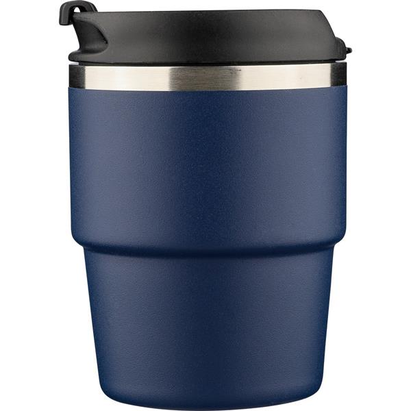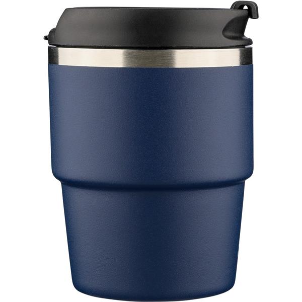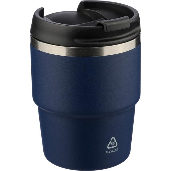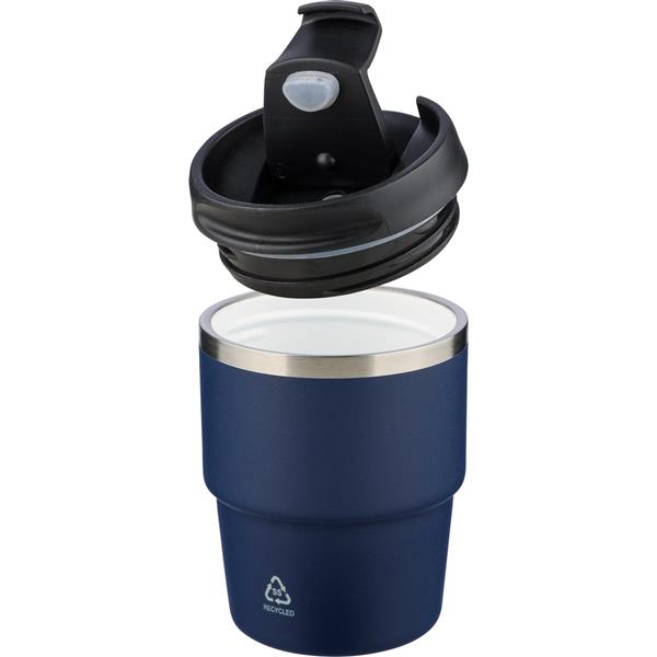 Kubek termiczny 175 ml, posiada podwójne ścianki ze stali nierdzewnej z próżnią między ściankami, co spowalnia oddawanie temperatury na zewnątrz, zachowując funkcje termosu, ikona recyklingu na produkcie, zapakowany pojedynczo w brązowe kartonowe pudełko, produkt wykonany z recyklingowej stali nierdzewnej (wewnątrz 304 / na zewnątrz 201) z pokrywką z PP, utrzymuje temperaturę napojów gorących do 4 godzin