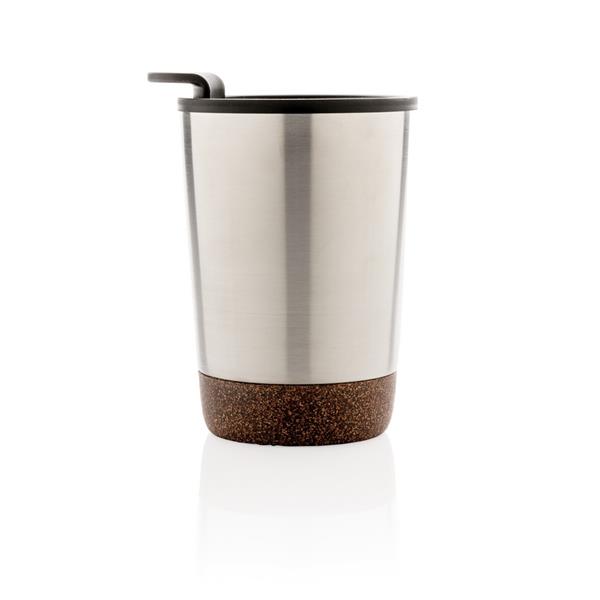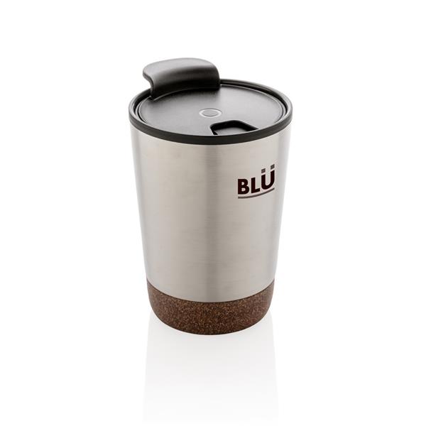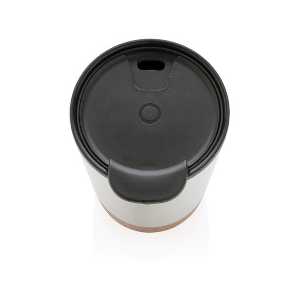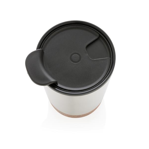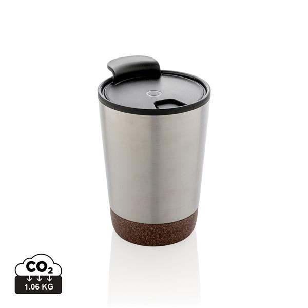 Kubek termiczny 300 ml, podwójne ścianki, wnętrze z PP z recyklingu z certyfikatem GRS, całkowita zawartość materiałów z recyklingu obliczona na podstawie wagi całkowitej produktu: 52%, korkowe elementy na zewnątrz, utrzymuje temperaturę ciepłych napojów do 3 godzin oraz zimnych do 6 godzin, klasa termiczna: D, ślad węglowy produktu: 1,01 kg CO2