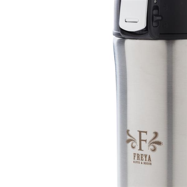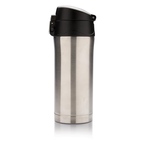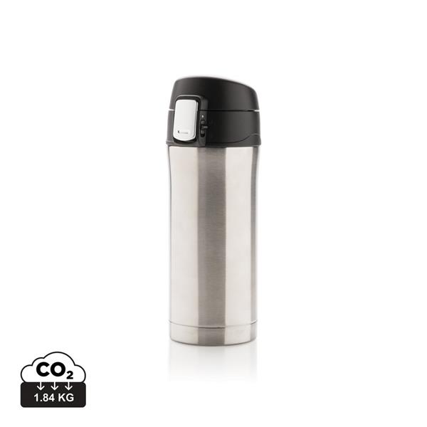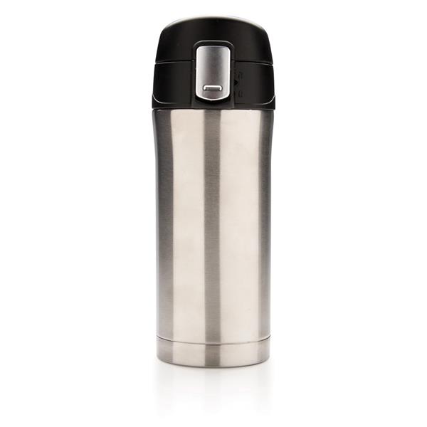 Kubek termiczny 300 ml, podwójne ścianki ze stali nierdzewnej z próżnią pomiędzy, obsługa jedną ręką, wykonany z materiałów pochodzących z recyklingu z certyfikatem RCS, całkowita zawartość materiałów z recyklingu obliczona na podstawie wagi całkowitej przedmiotu: 71%, w pudełku z papieru kraftowego, utrzymuje temperaturę napojów gorących do 20 godzin oraz zimnych do 15 godzin