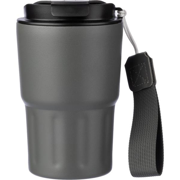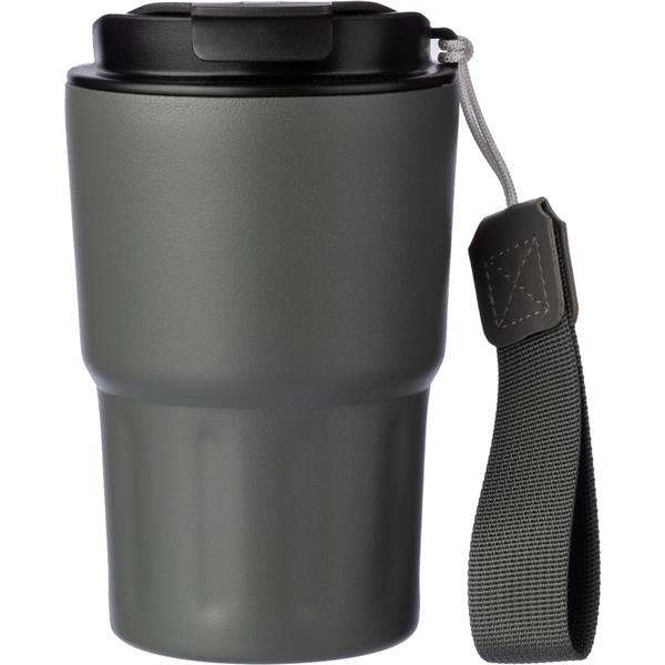Kubek termiczny 320 ml, posiada podwójne ścianki ze stali nierdzewnej z próżnią między ściankami, co spowalnia oddawanie temperatury na zewnątrz, zachowując funkcje termosu, pasek ułatwiający noszenie lub przypięcie, plastikowe wieczko z otwarciem umożliwiającym łatwą obsługę jedną ręką, dobrze trzyma temperaturę ciepłych i zimnych napojów, utrzymuje temperaturę napojów gorących do 10 godzin +leakproof