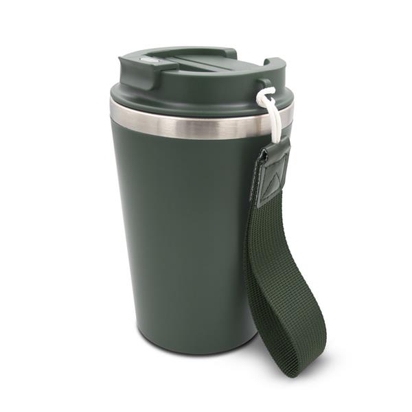 Kubek termiczny 350 ml, posiada podwójne ścianki ze stali nierdzewnej z recyklingu i plastiku, pasek ułatwiający noszenie lub przypięcie, produkt wykonany ze stali nierdzewnej z recyklingu i PP, klasa termiczna: D +leakproof