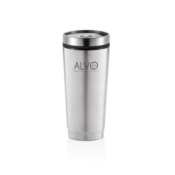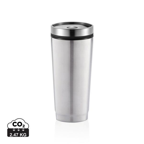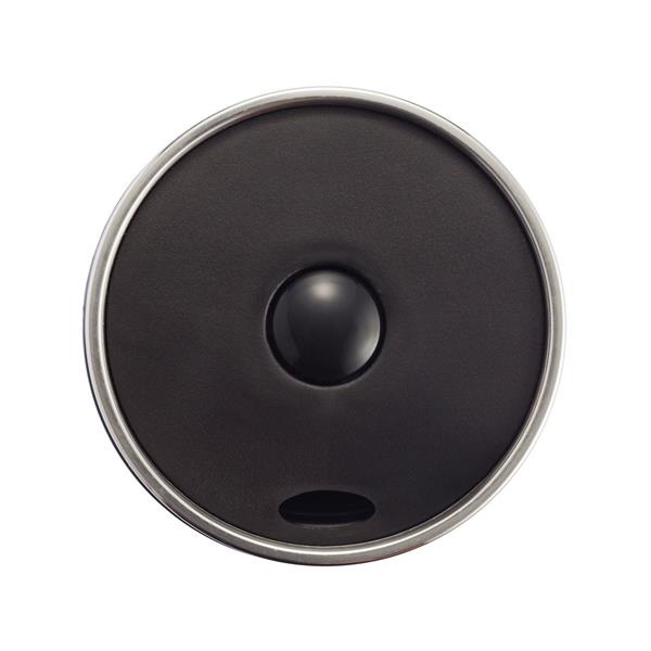 Kubek termiczny 350 ml, stal nierdzewna na zewnątrz, wnętrze z PP, wieczko z przyciskiem zamykającym zapobiegający wylaniu, nie wymaga obsługi oburącz, szczelny, utrzymuje temperaturę napojów gorących do 4 godzin