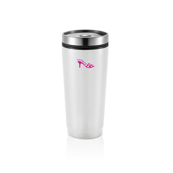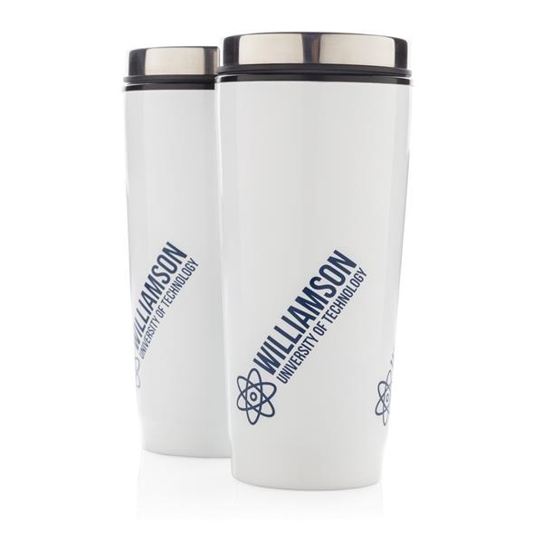 Kubek termiczny 350 ml, stal nierdzewna na zewnątrz, wnętrze z PP, wieczko z przyciskiem zamykającym zapobiegający wylaniu, nie wymaga obsługi oburącz, szczelny, utrzymuje temperaturę napojów gorących do 4 godzin