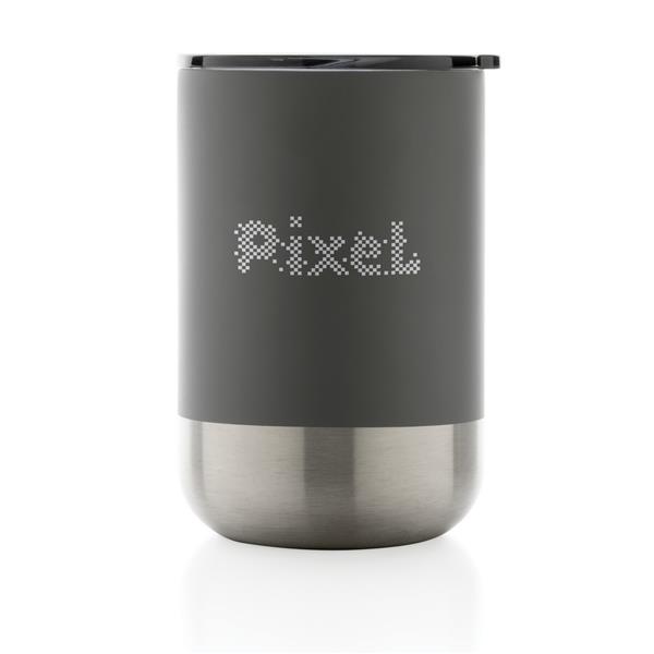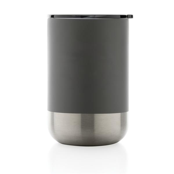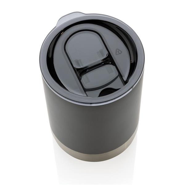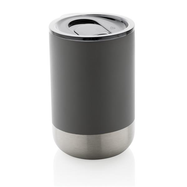 Kubek termiczny 360 ml, podwójne ścianki z próżnią pomiędzy, utrzymuje temperaturę napojów ciepłych do 3 godzin oraz zimnych do 6 godzin, wieczko zapobiegające rozlewaniu, wykonany ze stali nierdzewnej z recyklingu z certyfikatem RCS (Recycled Claim Standard) który gwarantuje, że wykorzystane materiały pochodzą z recyklingu, całkowita zawartość materiału z recyklingu obliczona w oparciu o wagę całkowitą przedmiotu: 83%, w pudełku z papieru kraftowego