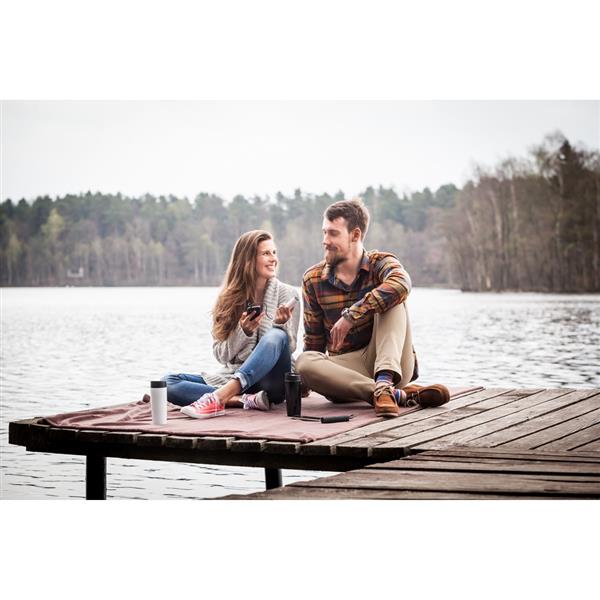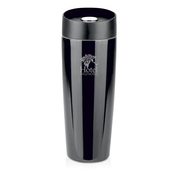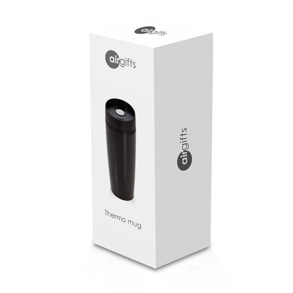Kubek termiczny 375 ml Air Gifts, posiada podwójne ścianki ze stali nierdzewnej z miedzianą izolacją próżniową, co spowalnia oddawanie temperatury na zewnątrz, zachowując funkcje termosu, plastikowe wieczko z przyciskiem otwarcia/zamknięcia ustnika umożliwiającym obsługę jedną ręką, błyszczące wykończenie, utrzymuje temperaturę napojów gorących do 10 godzin +leakproof