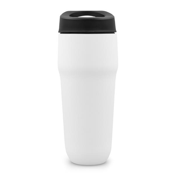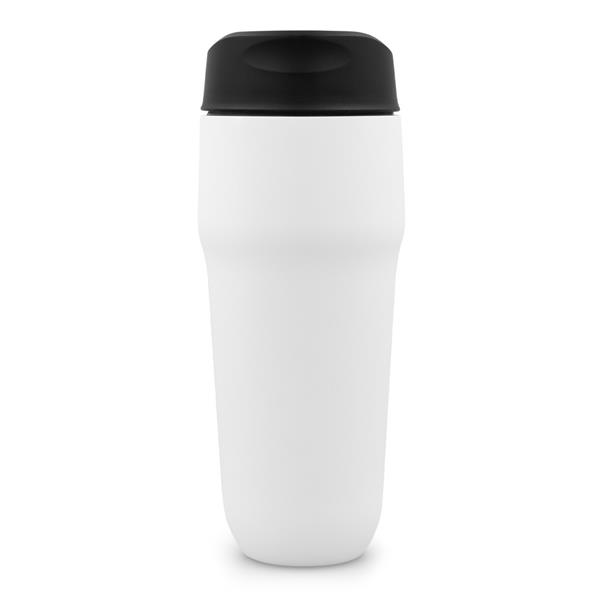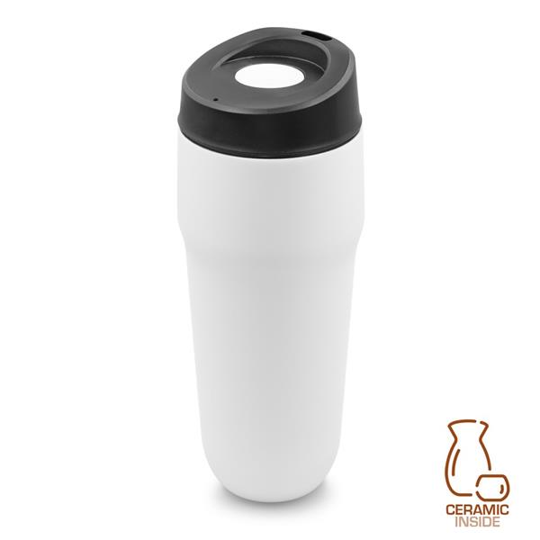 Kubek termiczny 400 ml Air Gifts, posiada podwójne ścianki ze stali nierdzewnej i ceramiki z próżnią między ściankami, co spowalnia oddawanie temperatury na zewnątrz, zachowując funkcje termosu, plastikowe wieczko z przyciskiem otwarcia/zamknięcia ustnika umożliwiającym obsługę jedną ręką, wieczko może zostać rozkręcone w celu ułatwienia czyszczenia, matowe wykończenie, produkt wykonany ze stali nierdzewnej, ceramiki i plastiku, utrzymuje temperaturę napojów gorących do 15 godzin +leakproof