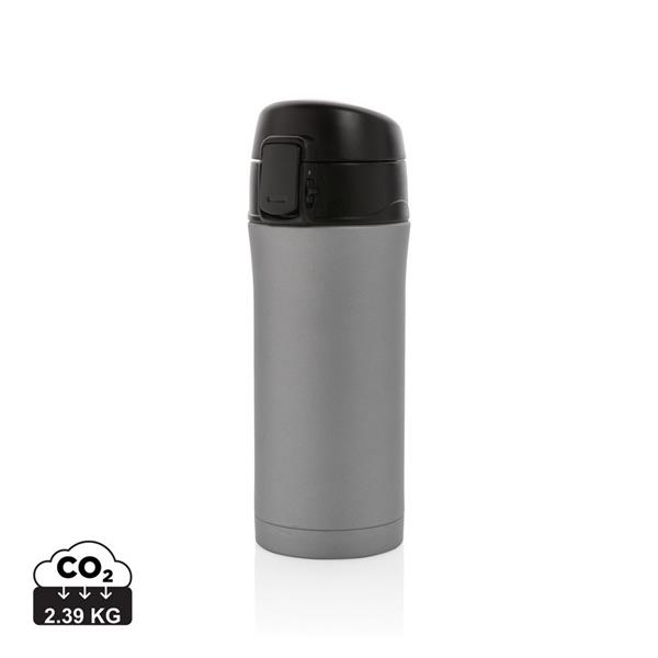 Kubek termiczny 400 ml Air Gifts, posiada podwójne ścianki ze stali nierdzewnej i ceramiki z próżnią między ściankami, co spowalnia oddawanie temperatury na zewnątrz, zachowując funkcje termosu, plastikowe wieczko z przyciskiem otwarcia/zamknięcia ustnika umożliwiającym obsługę jedną ręką, wieczko może zostać rozkręcone w celu ułatwienia czyszczenia, matowe wykończenie, produkt wykonany ze stali nierdzewnej, ceramiki i plastiku, klasa termiczna: B +leakproof