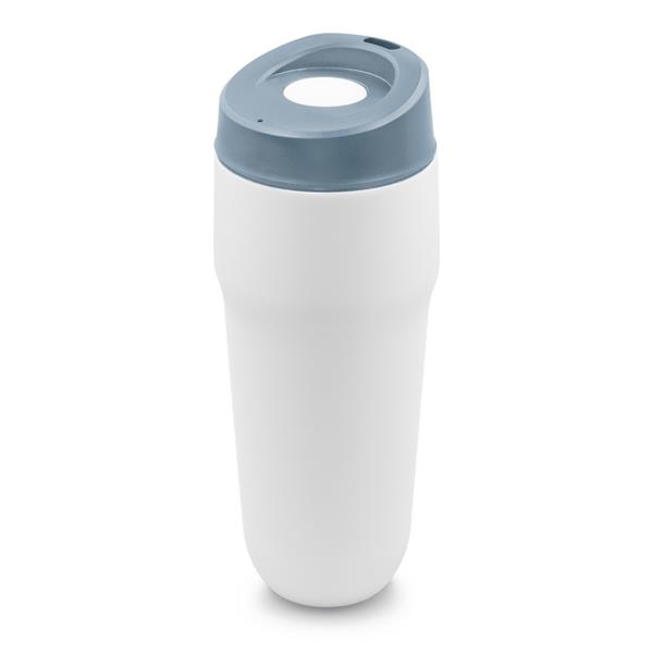 Kubek termiczny 400 ml Air Gifts, posiada podwójne ścianki ze stali nierdzewnej i ceramiki z próżnią między ściankami, co spowalnia oddawanie temperatury na zewnątrz, zachowując funkcje termosu, plastikowe wieczko z przyciskiem otwarcia/zamknięcia ustnika umożliwiającym obsługę jedną ręką, wieczko może zostać rozkręcone w celu ułatwienia czyszczenia, matowe wykończenie, produkt wykonany ze stali nierdzewnej, ceramiki i plastiku, klasa termiczna: B +leakproof