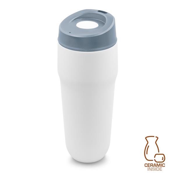 Kubek termiczny 400 ml Air Gifts, posiada podwójne ścianki ze stali nierdzewnej i ceramiki z próżnią między ściankami, co spowalnia oddawanie temperatury na zewnątrz, zachowując funkcje termosu, plastikowe wieczko z przyciskiem otwarcia/zamknięcia ustnika umożliwiającym obsługę jedną ręką, wieczko może zostać rozkręcone w celu ułatwienia czyszczenia, matowe wykończenie, produkt wykonany ze stali nierdzewnej, ceramiki i plastiku, utrzymuje temperaturę napojów gorących do 15 godzin +leakproof