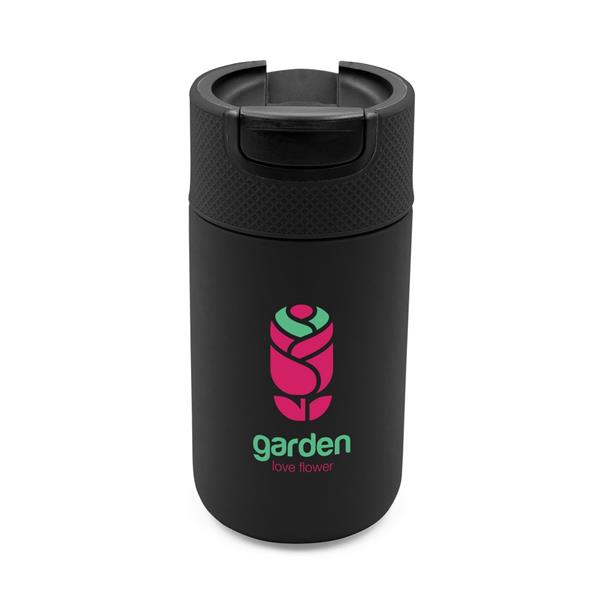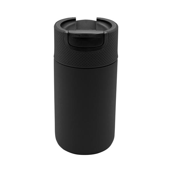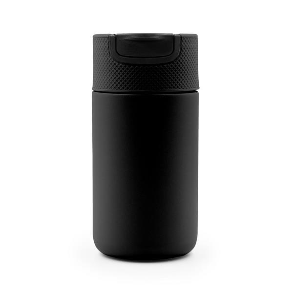 Kubek termiczny 400 ml Air Gifts, posiada podwójne ścianki ze stali nierdzewnej z próżnią między ściankami, co spowalnia oddawanie temperatury na zewnątrz, zachowując funkcje termosu, plastikowe wieczko z zamknięciem umożliwiającym obsługę jedną ręką, matowe wykończenie, utrzymuje temperaturę napojów gorących do 10 godzin +leakproof