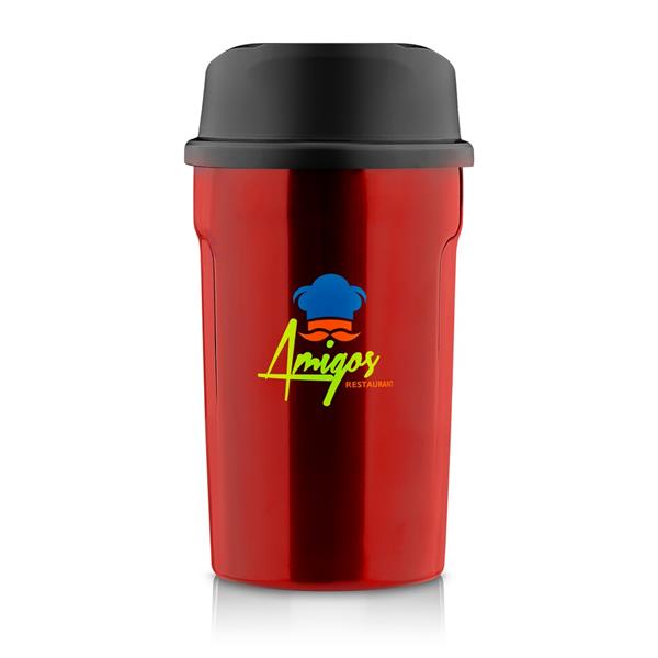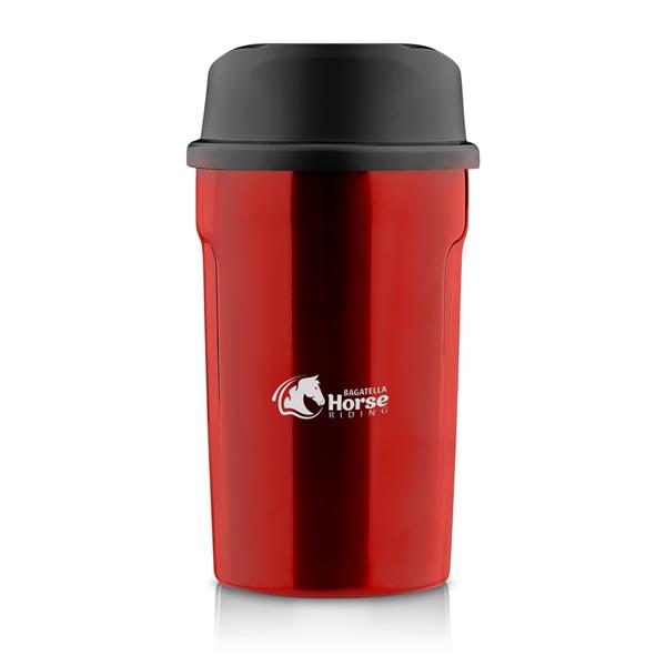 Kubek termiczny 400 ml Air Gifts, posiada podwójne ścianki ze stali nierdzewnej z miedzianą izolacją próżniową, co spowalnia oddawanie temperatury na zewnątrz, zachowując funkcje termosu, plastikowe wieczko z przyciskiem otwarcia/zamknięcia ustnika umożliwiającym obsługę jedną ręką, błyszczące wykończenie, utrzymuje temperaturę napojów gorących do 15 godzin +leakproof