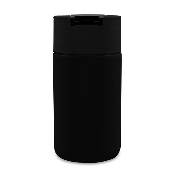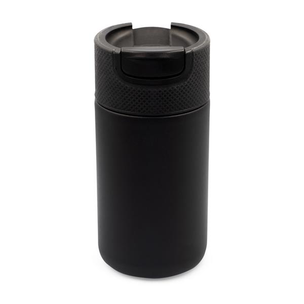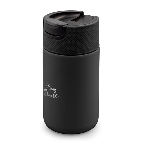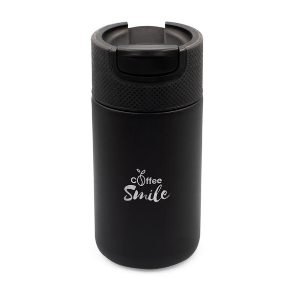 Kubek termiczny 400 ml Air Gifts, posiada podwójne ścianki ze stali nierdzewnej i ceramiki z próżnią między ściankami, co spowalnia oddawanie temperatury na zewnątrz, zachowując funkcje termosu, plastikowe wieczko z zamknięciem umożliwiającym obsługę jedną ręką, matowe wykończenie, produkt wykonany z metalu, ceramiki i plastiku, klasa termiczna: C +leakproof