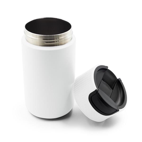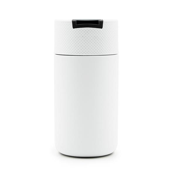 Kubek termiczny 400 ml Air Gifts, posiada podwójne ścianki ze stali nierdzewnej z próżnią między ściankami, co spowalnia oddawanie temperatury na zewnątrz, zachowując funkcje termosu, plastikowe wieczko z zamknięciem umożliwiającym obsługę jedną ręką, matowe wykończenie, utrzymuje temperaturę napojów gorących do 10 godzin +leakproof