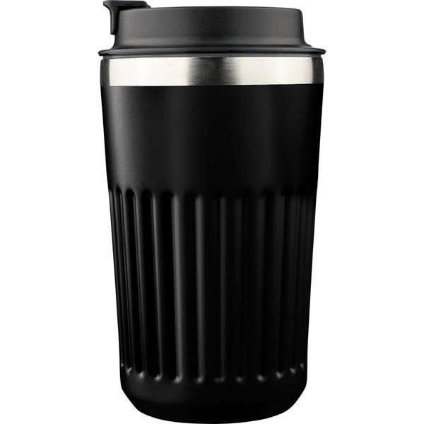 Kubek termiczny 400 ml, posiada podwójne ścianki ze stali nierdzewnej z próżnią między ściankami, co spowalnia oddawanie temperatury na zewnątrz, zachowując funkcje termosu, ikona recyklingu na produkcie, zapakowany w brązowy kartonik, produkt wykonany ze stali nierdzewnej (304 w środku i 201 na zewnątrz), silikonu i PP