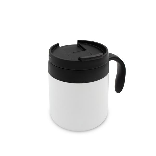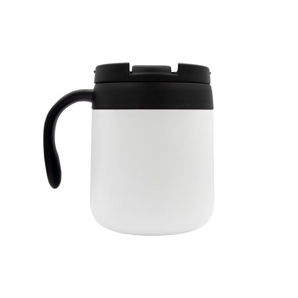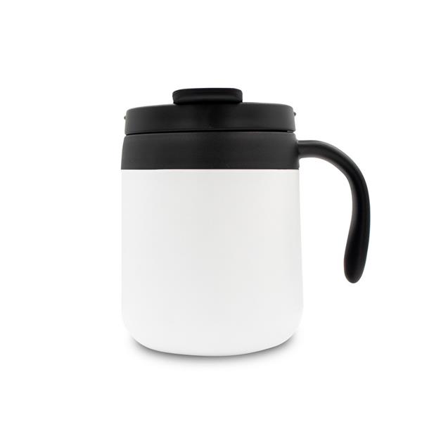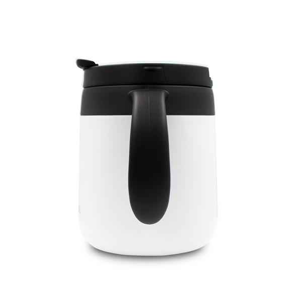 Kubek termiczny 400 ml z rączką, posiada podwójne ścianki ze stali nierdzewnej z próżnią między ściankami, co spowalnia oddawanie temperatury na zewnątrz, zachowując funkcje termosu, plastikowe wieczko z zamknięciem umożliwiającym obsługę jedną ręką, matowe wykończenie, utrzymuje temperaturę napojów gorących do 10 godzin