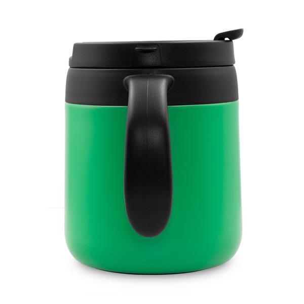 Kubek termiczny 400 ml z rączką, podwójne ścianki ze stali nierdzewnej z próżnią między ściankami, plastikowe wieczko, nie wymaga obsługi oburącz, matowe wykończenie, klasa termiczna: 2