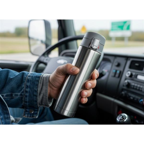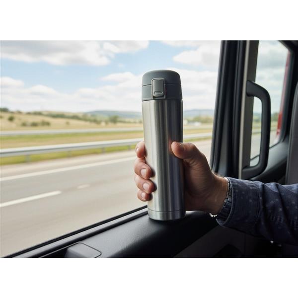 Kubek termiczny 450 ml z podwójnymi ściankami ze stali nierdzewnej z izolacją próżniową spowalniającą oddawanie temperatury na zewnątrz i zachowującą właściwości termosu, wyposażony w płaskie wieczko typu lock z wygodnym mechanizmem otwierania jedną ręką, szczelna konstrukcja leakproof