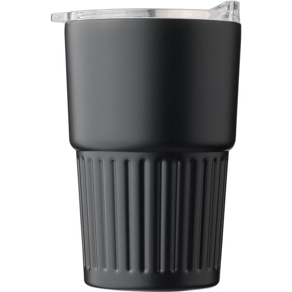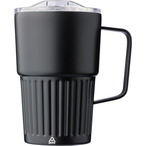 Kubek termiczny 450 ml ze stali nierdzewnej, posiada podwójne ścianki, które spowalniają oddawanie temperatury na zewnątrz, zewnętrzna część wykonana jest ze stali nierdzewnej 201, a wewnętrzna ścianka ze stali nierdzewnej 304, uchwyt ułatwiający noszenie, wieczko z zamknięciem wykonane z AS, ikona recyklingu na produkcie, zapakowany w brązowe kartonowe pudełko