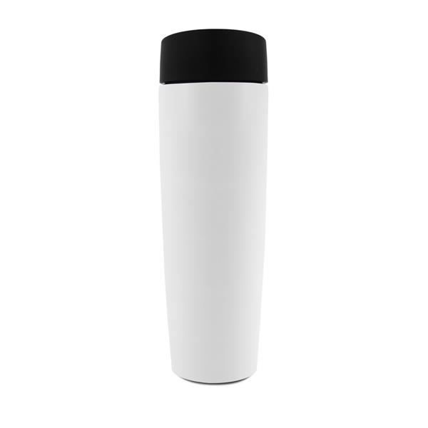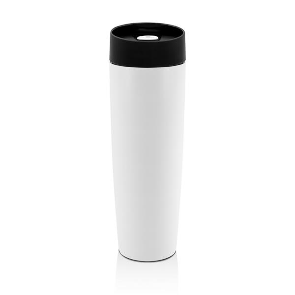 Kubek termiczny 500 ml Air Gifts, posiada podwójne ścianki ze stali nierdzewnej z miedzianą izolacją próżniową, co spowalnia oddawanie temperatury na zewnątrz, zachowując funkcje termosu, plastikowe wieczko z przyciskiem otwarcia/zamknięcia ustnika umożliwiającym obsługę jedną ręką, matowe wykończenie, utrzymuje temperaturę napojów gorących do 20 godzin +leakproof