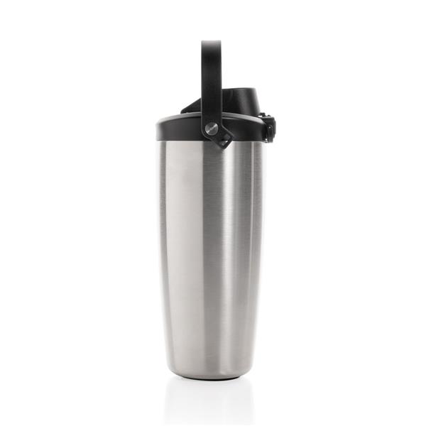 Kubek termiczny 600 ml, posiada ustnik, słomkę oraz pasek do noszenia, nie wymaga obsługi oburącz, podwójne ścianki ze stali nierdzewnej z próżnią pomiędzy, wykonany ze stali nierdzewnej z recyklingu z certyfikatem RCS