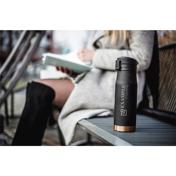 Kubek termiczny 600 ml Mauro Conti, posiada podwójne ścianki ze stali nierdzewnej z miedzianą izolacją próżniową, co spowalnia oddawanie temperatury na zewnątrz, zachowując funkcje termosu, wieczko z blokadą i przyciskiem otwarcia ustnika umożliwiającym obsługę jedną ręką, klasa termiczna: B +leakproof