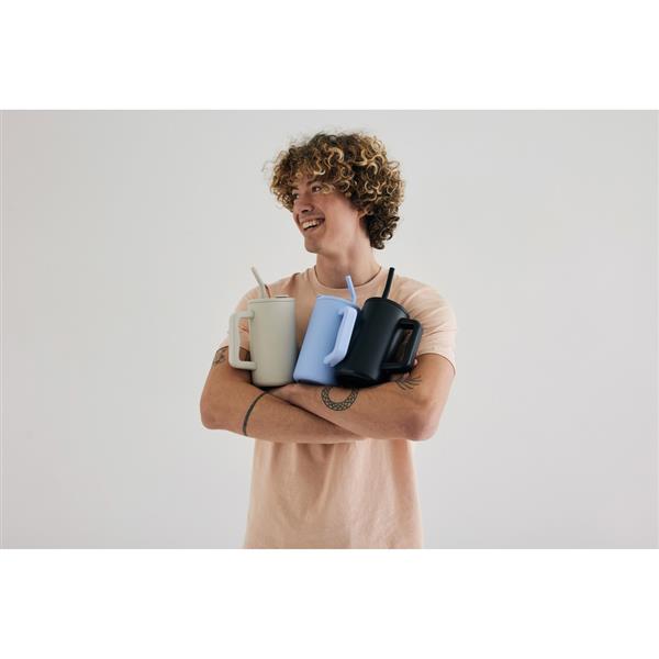 Kubek termiczny 800 ml, posiada słomkę z silikonową nakładką, zakręcane wieczko, wykonany ze stali nierdzewnej z recyklingu, podwójne ścianki ze stali nierdzewnej z próżnią między ściankami, dzięki czemu zachowuje funkcje termosu i długo utrzymuje temperaturę nie oddając jej na zewnątrz, zalecane mycie ręczne