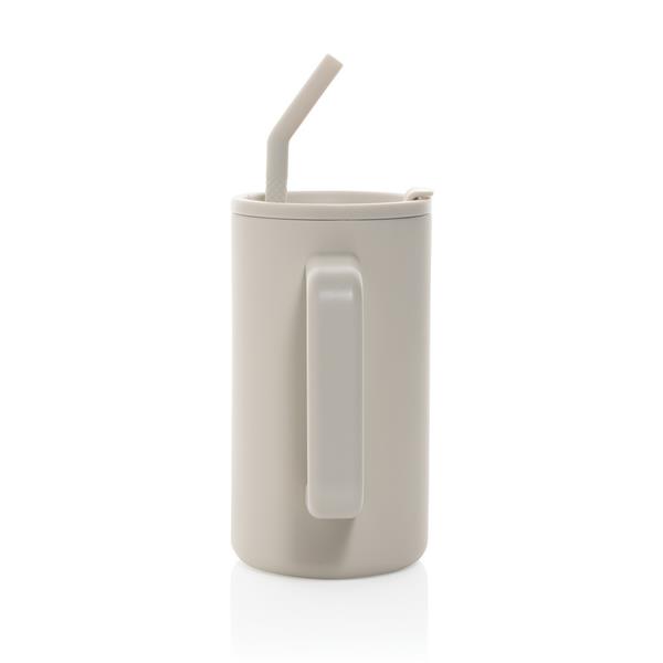 Kubek termiczny 800 ml, posiada słomkę z silikonową nakładką, zakręcane wieczko, wykonany ze stali nierdzewnej z recyklingu, podwójne ścianki ze stali nierdzewnej z próżnią między ściankami, dzięki czemu zachowuje funkcje termosu i długo utrzymuje temperaturę nie oddając jej na zewnątrz, zalecane mycie ręczne