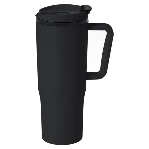 Kubek termiczny 800 ml, posiada pokrywkę, rączkę i otwór na słomkę, posiada podwójne ścianki ze stali nierdzewnej z próżnią między ściankami, co spowalnia oddawanie temperatury na zewnątrz, zachowując funkcje termosu, produkt wykonany z PP z recyklingu